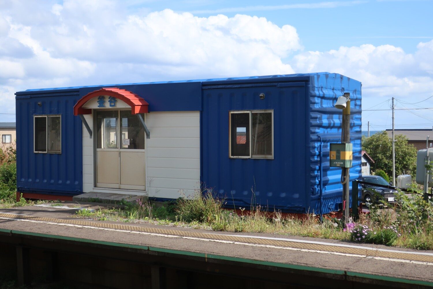 深い青色、対照的な白、そして駅名と足場にワンポイントの赤。道南いさりび鉄道の釜谷(かまや)駅に近づくと、この鮮やかな色合いが目に飛び込んでくる。