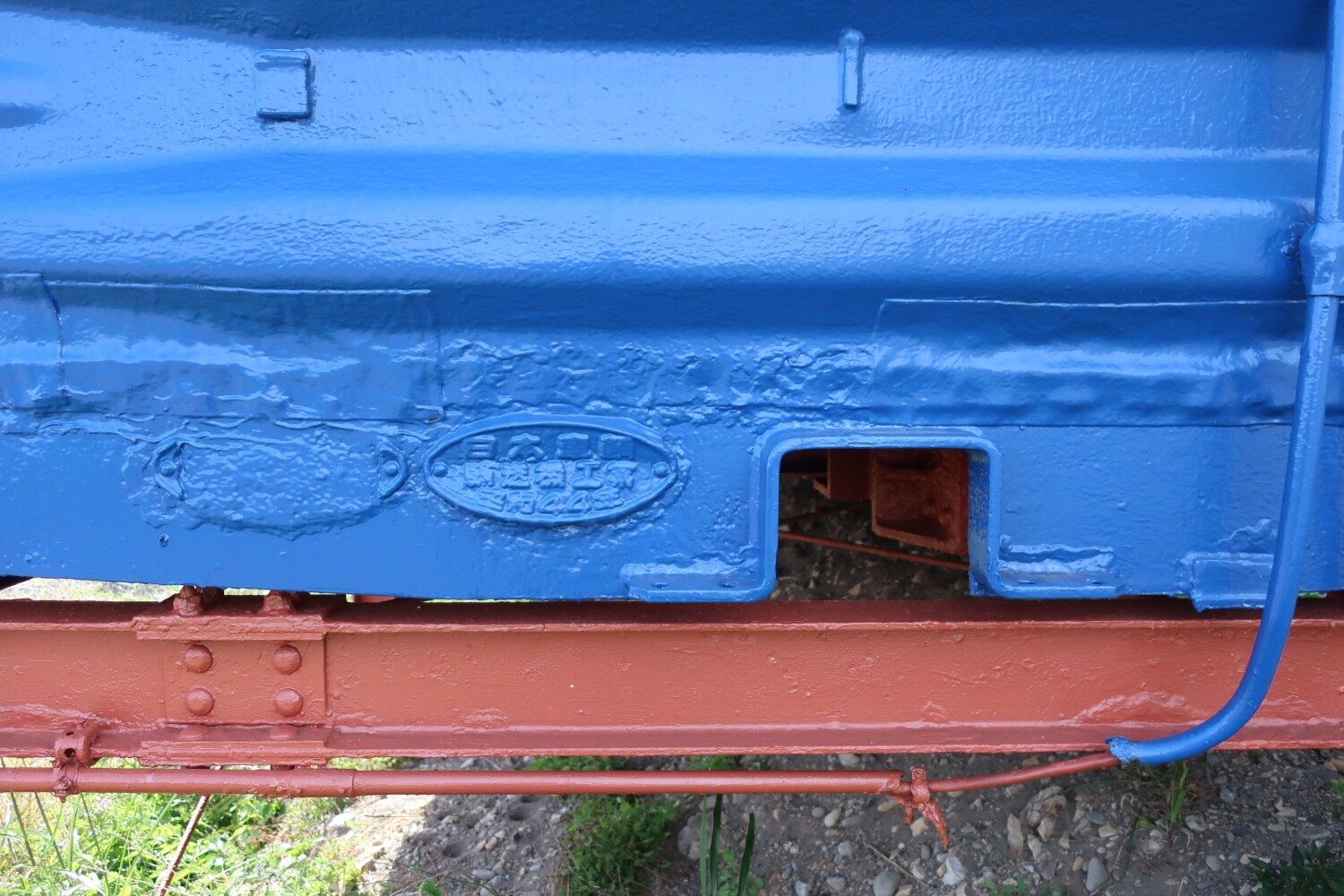 銘板は「日本車輌 輸送機工業 昭和44年」と読める。Wikipediaによると、航空機部品メーカーの輸送機工業は、一時期日本車輌製造と同じグループになり、貨車を製造していたことがあるという。貨車としては約17年働いたのだが、ダルマ駅になってその2倍以上、40年近く働いているのだ。