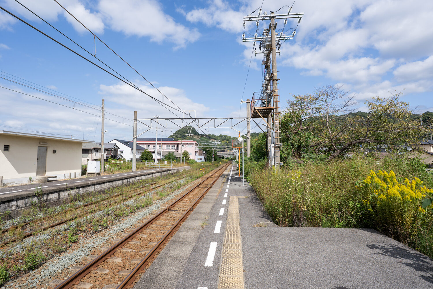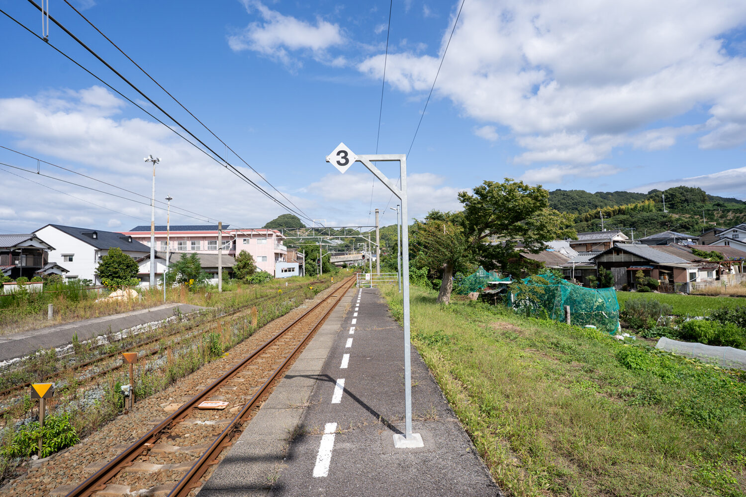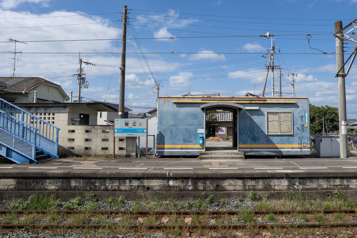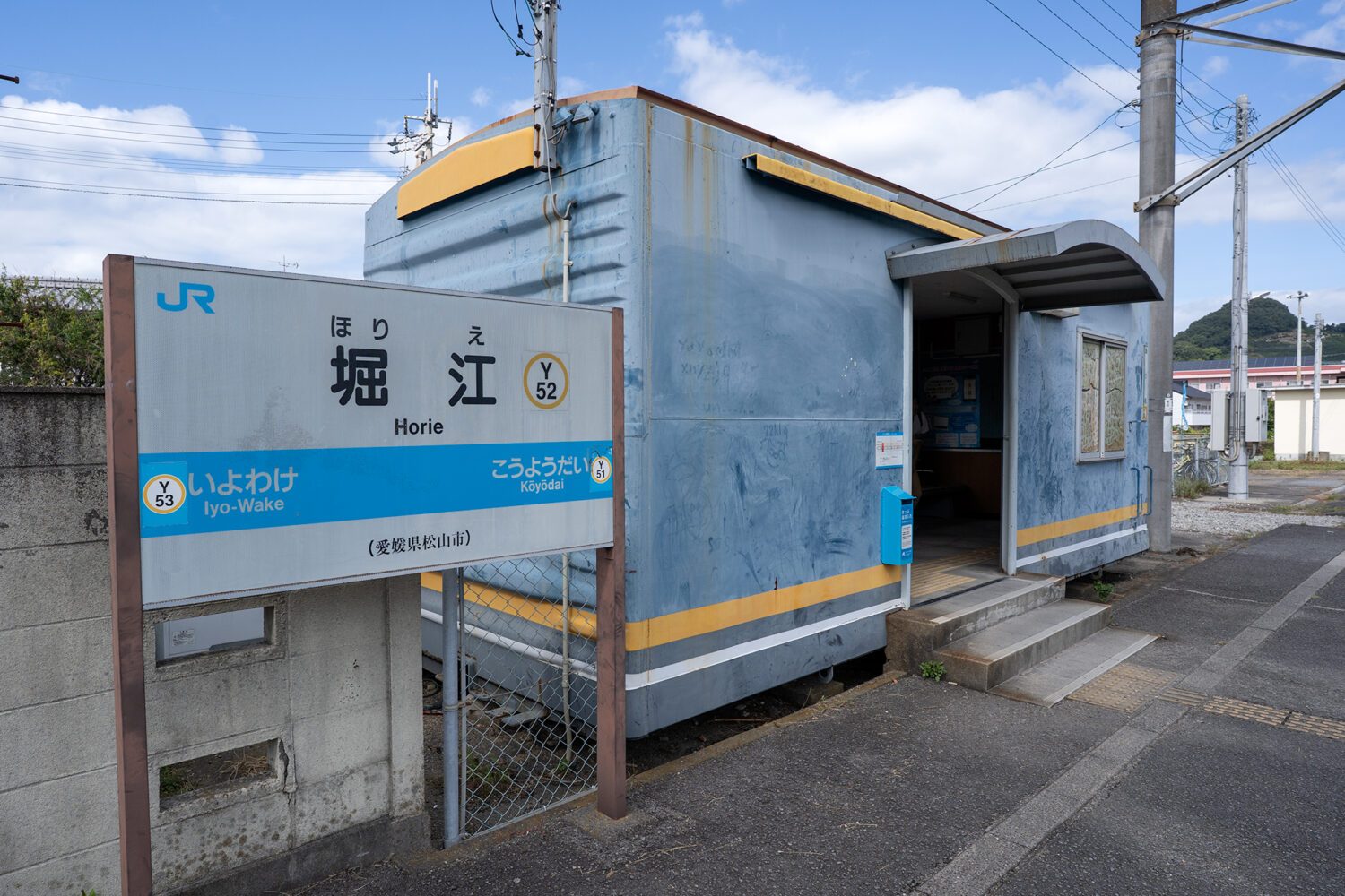 堀江駅は、高松と宇和島を結ぶJR予讃線の駅だ。古くは仁堀連絡船(愛媛県松山市の堀江港と広島県呉市の仁方港の間を運航)を利用する人の乗換え駅でもあったが、昭和57年に航路が廃止され、昭和62年には国鉄民営化によりJR四国の駅となった。現在の堀江駅は、昭和59年に設置されたダルマ駅だ。