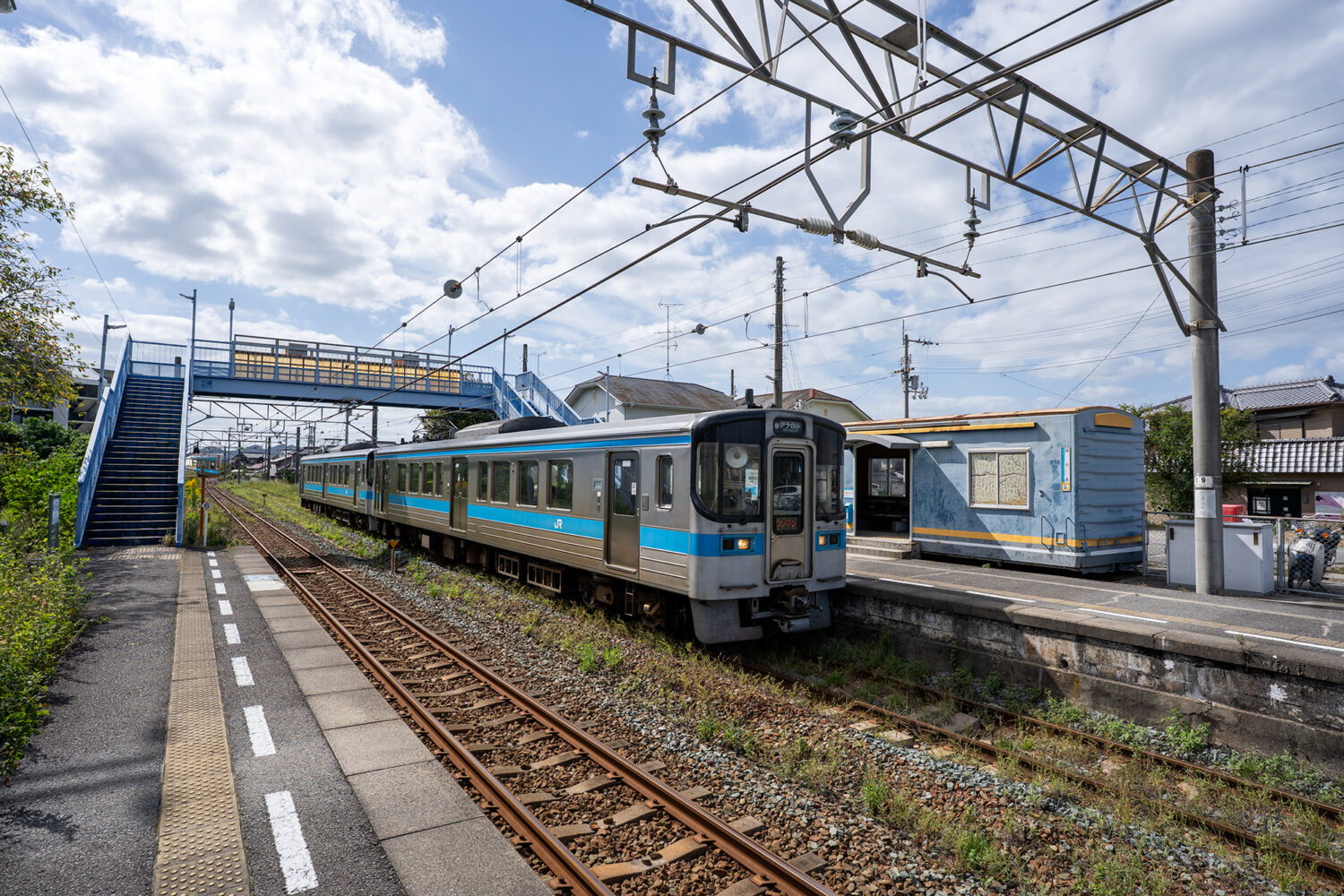 伊予西条行きの上り列車が入線してきた。堀江駅のある区間が電化されていて、ご覧のとおり秘境駅感はまったくない