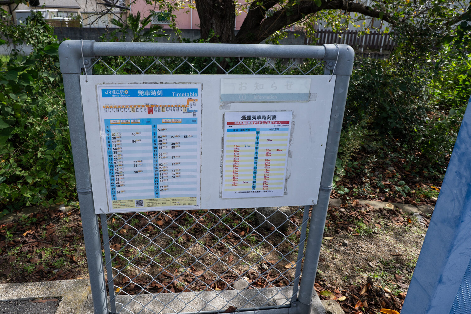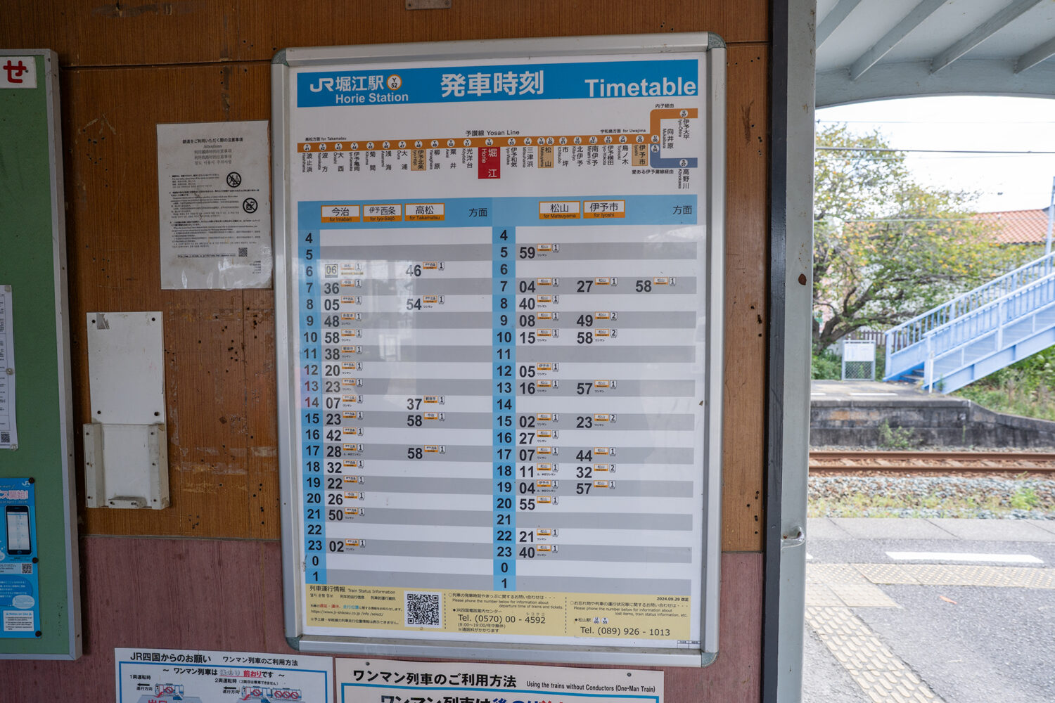 跨線橋を降りてすぐ、2番線ホームにあった案内板。堀江駅を通過する列車の時刻表があった。これの一部がアンパンマン列車なのだろう