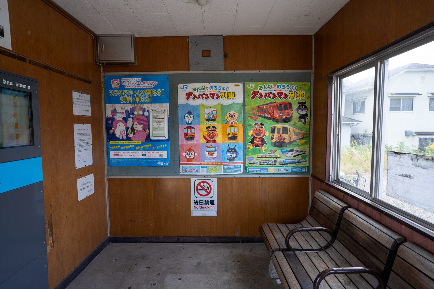 南西側の壁。JR四国と言えば、アンパンマン列車だ。堀江駅は特急は停車しないので、残念ながらアンパンマン列車はダルマ駅を通り過ぎる(おそらく)