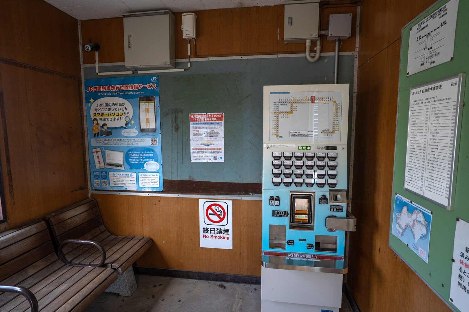 駅舎内には券売機がある。ダルマ駅に限らず無人駅では、券売機が撤去され、きっぷ回収箱や簡易型のIC改札機のみの場合が多い。現在知る限り、券売機のあるダルマ駅は、道南いさりび鉄道の東久根別(ひがしくねべつ)駅ぐらいだろうか