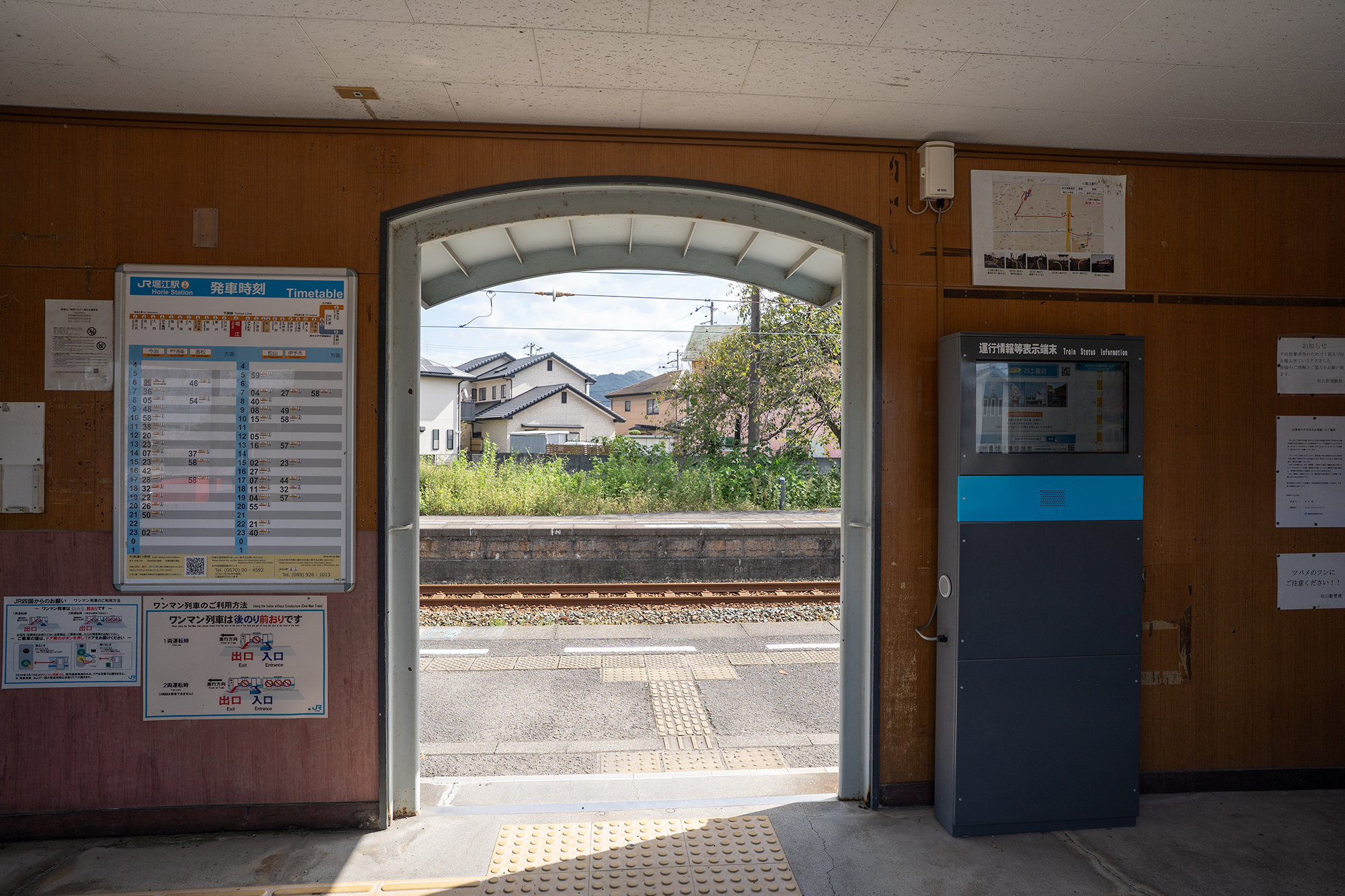 1番線ホームから駅舎を撮影。出入り口のひさしの上にあるオレンジ色のバーは、かつてのハンガーレール。貨車時代は左右に動く荷物搬入用扉がはめ込まれていた。側面からみると、有蓋貨車独特の天井のカーブがよくわかる