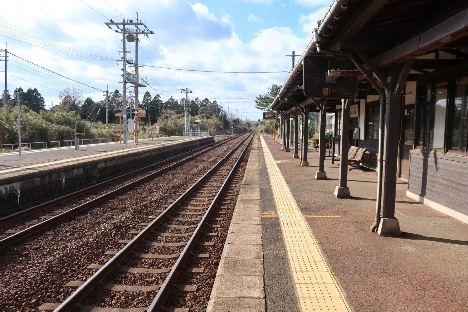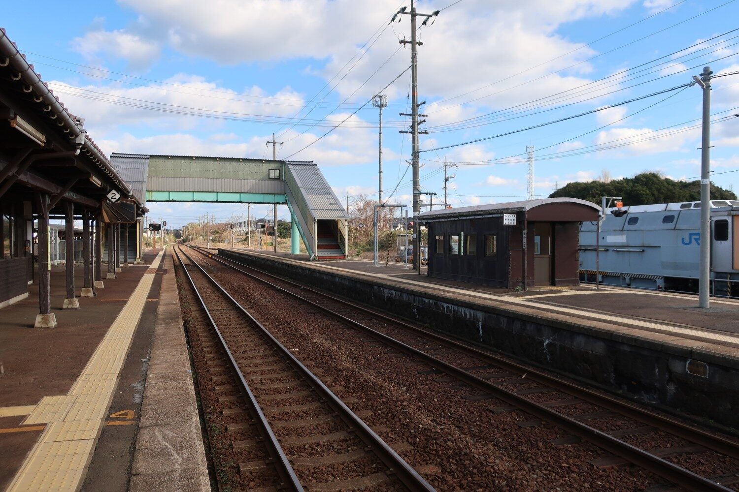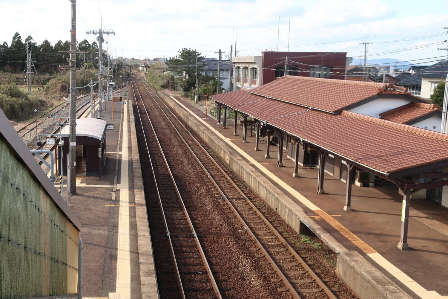 御来屋駅は、駅舎(駅舎については後述)からつながる1番線と、跨線橋で渡る2番線・3番線の2面3線構造。国鉄時代からの古い駅によくある駅構造だ。待合室と駅舎の関係は次の写真で把握できるだろう。